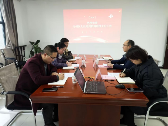 1月11日,万州区人社局副局长胡萍、专技科科长丁江云一行来校调研学校博士后科研工作站运行情况。人事处副处长赵滟对胡萍副局长及随行人员的到来表示热烈欢迎,介绍了学校博士后科研工作站的基本情况、经验做法和工作计划,并向区博管办提出了工作建议。胡萍副局长对学校博士后工作站的运行和取得的成绩给予了肯定,希望工作站加强与区博管办之间的沟通,共同促进全区博士后事业高质量发展。